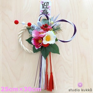 こちらはピンクと白の椿、白紫の水引がステキなしめ縄リース、